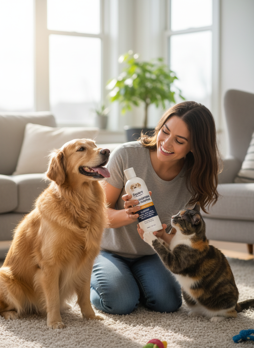 Mouiller le pelage, appliquer une quantité adaptée, masser délicatement jusqu’à obtention d’une mousse légère, puis rincer abondamment. Usage externe uniquement.